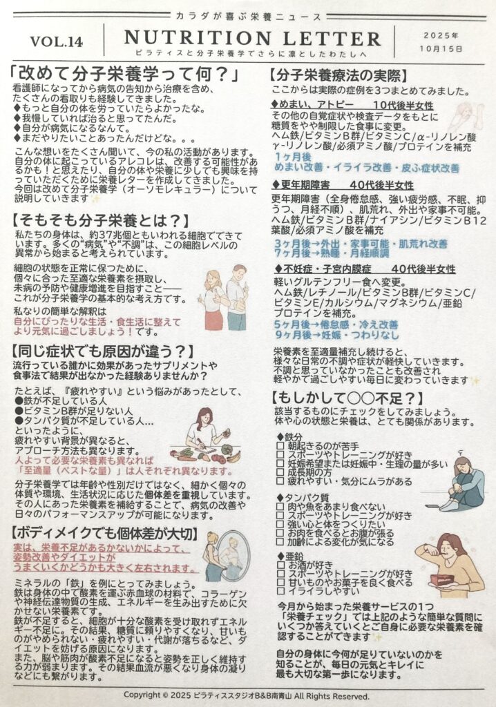 おはようございます😃 ピラティススタジオBB南青山オーナーの出井です。 果物が美味しい季節ですね! 我が家は梨が終わりリンゴを 食べ始めています🍎 さて、 分子栄養学カウンセラーの ハル先 […]