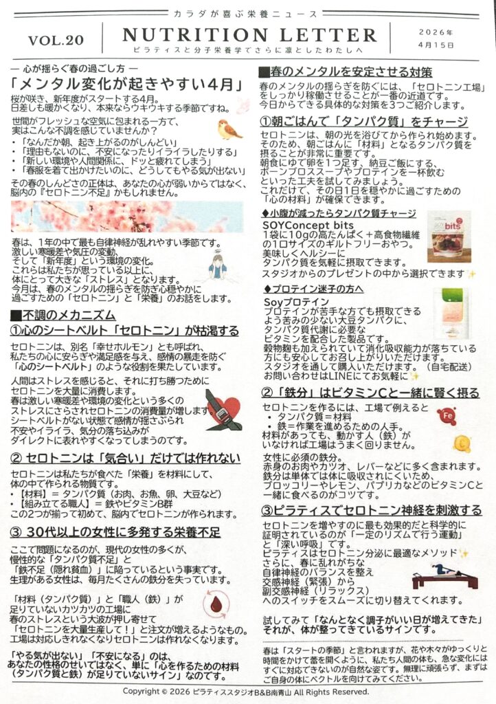 今月の栄養レター『メンタル変化が起きやすい4月』☆